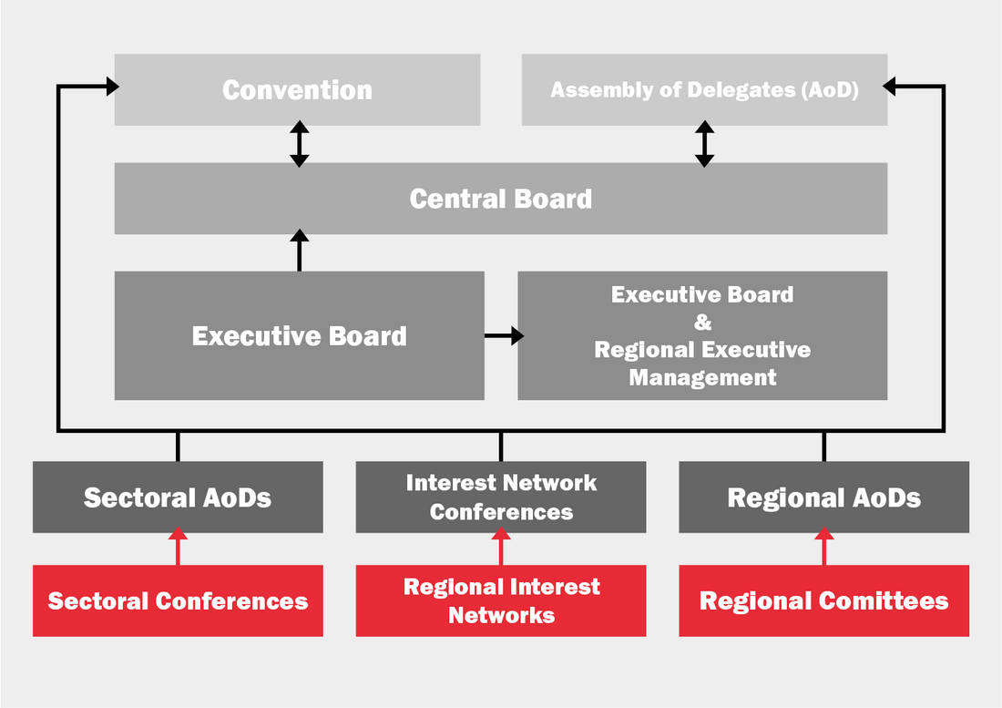 At least 33% of convention delegates and of assembly of delegates, as well as elected representatives on the Central Board and Executive Board, must be female. Men and women are represented on the organs of the sectors and regions proportionate to their ratio in the respective group.
